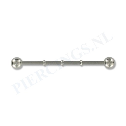 Industrial barbellGemaakt van chirurgisch staal; het staafje is verwisselbaar.1,6 x 35 x 5 mm balletjes (dikte staafje x lengte staafje x dikte balletje)