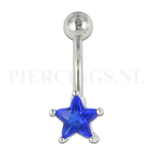 Navelpiercing met ster van zirkonia in de kleur blauwGemaakt van chirurgisch staal.1,6 x 10 mm x 5 mm balletje en 8 mm ster (dikte staafje x lengte staafje x dikte balletje)